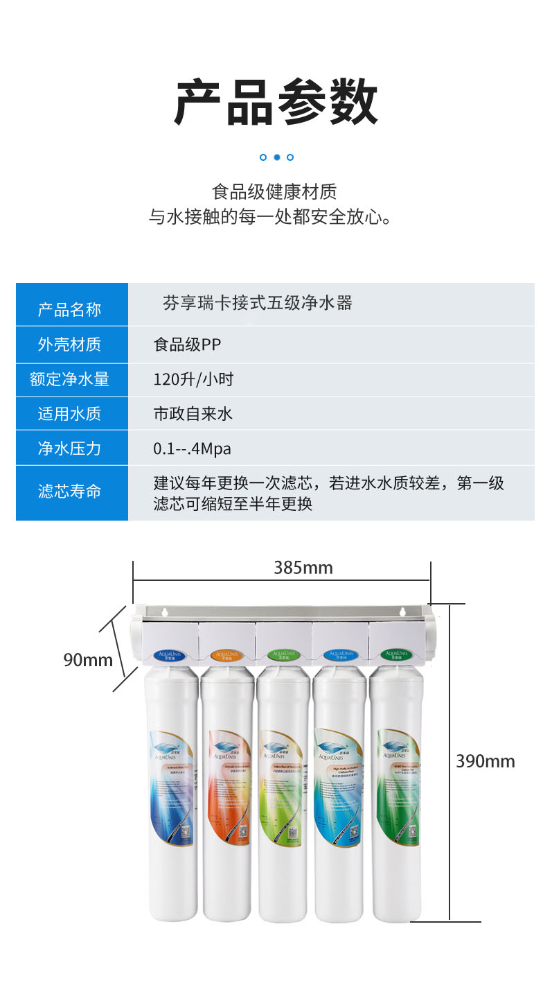 5吨阻垢处理量,后置升级为微生物安全滤膜, 高效吸附并杀灭微生物,口感一流 |